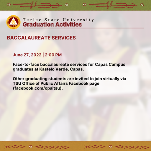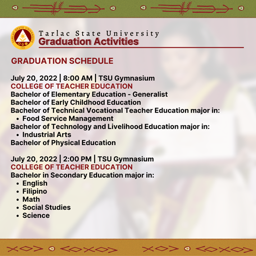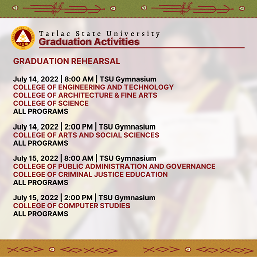 Tarlac State University will conduct face-to-face graduation ceremonies from June 27 to July 22, 2022 themed "Transformative, Innovative, and Interconnected Higher Education, Paving the Way to Greater Heights and Stronger Tomorrows."