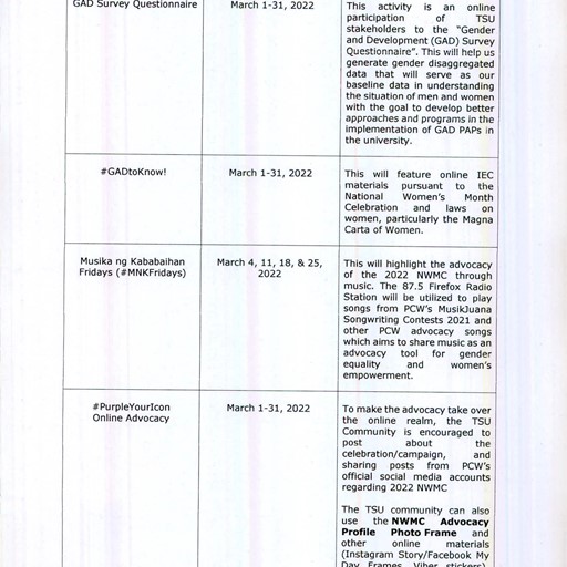 The annual celebration of the Women's Month is from March 1 to 31 and subsequently served as a venue to feature women's achievements and discuss continuing and emerging women's empowerment and gender equality issues and concerns, challenges and commitments. The celebration focuses on concrete activities that are aligned with national and international instruments and treaties such as the Convention on the Elimination of All forms of Discrimination Against Women, the Beijing Platform for Action, the Philippine Plan for Gender-Responsive Development (1995-2025), the Framework Plan for Women, and the Sustainable Development Goals.